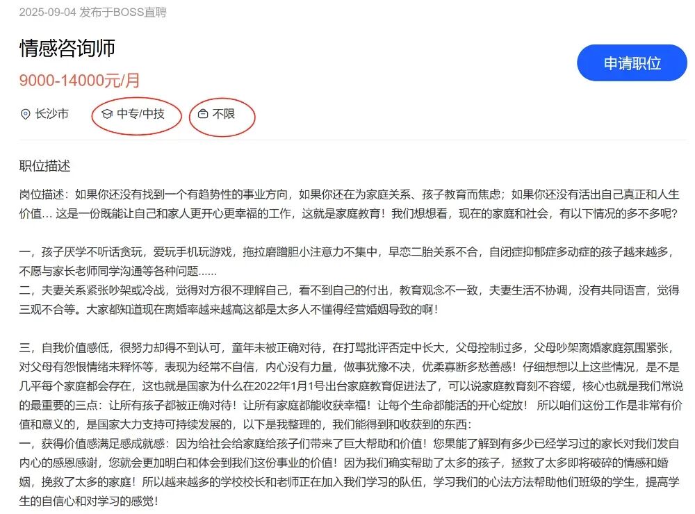 在招聘平台上,很多小型公司都在招聘情感咨询师这个岗位,要求也不高,经验不限、学历不限、电话销售优先。