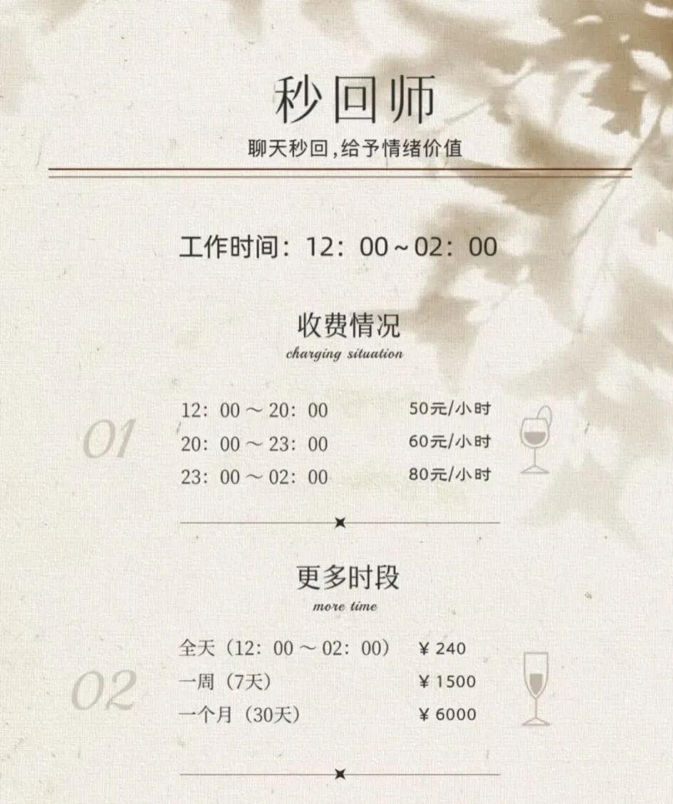 社交媒体上经常能刷到这样的广告:“秒回师营业啦!”并附带明码标价的不同时段表,白天20元、深夜60元,恰好和大家“网抑云emo”的时间对应,虽然算不上什么科学,但刚好能给确定性的即时回应与专注的倾听。