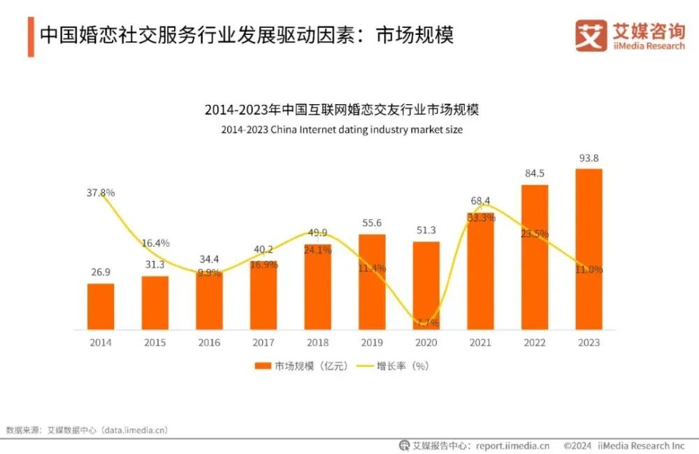 根据艾媒咨询发布的《2024-2025年中国婚恋社交服务市场研究报告》显示,中国婚恋社交服务市场份额,2023年已经达到93.8亿元。