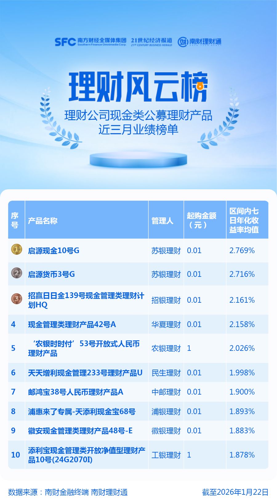 产品统计范围为理财公司发行的公募现金类产品,统计截止日期为2026年1月22日,统计区间为近3个月。