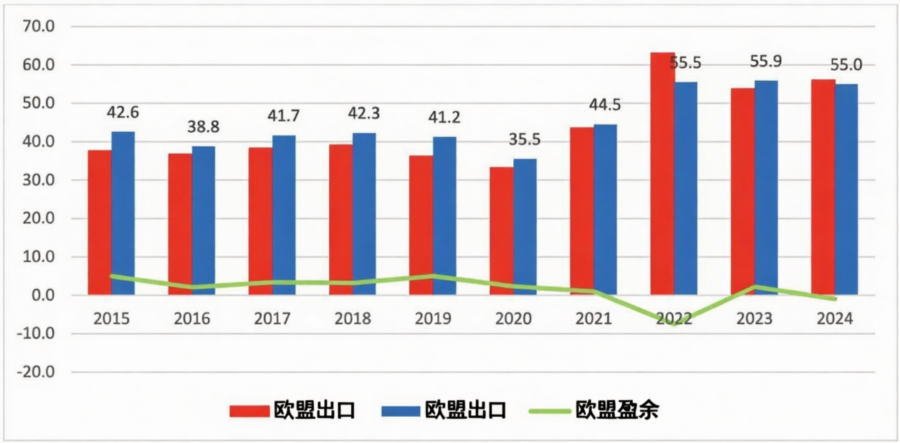 图1: 2015—2024年南共市对欧盟进出口情况(单位:十亿欧元)