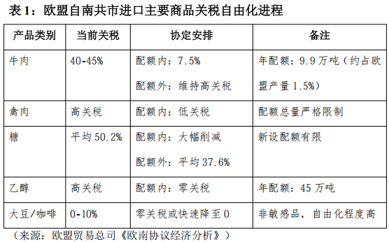 对欧盟而言,其核心策略是对最敏感的农产品实施严格的配额管理。例如,牛肉的年免税进口配额仅为9.9万吨,这一数量仅相当于欧盟自身牛肉产量的1.5% 以及目前从南共市进口量的大约一半。禽肉、猪肉等其他产品也有类似的严格配额限制(见表1)。这种“配额内优惠、配额外高关税”的模式,旨在平息法国、波兰等欧盟成员国农民的强烈反对。欧盟还在协议中增设了独特的 “双边保障机制” ,允许其在特定农产品进口激增时快速暂停关税减让,为农业部门提供了双重保险。相比之下,对于大豆、咖啡等非敏感产品,欧盟大多承诺了快速的零关税准入。