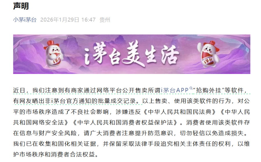 同时,i茅台还表示,未来将持之以恒提升技术水平,不断增强平台的风险防控能力,努力为广大消费者营造公平、有序的消费环境。
