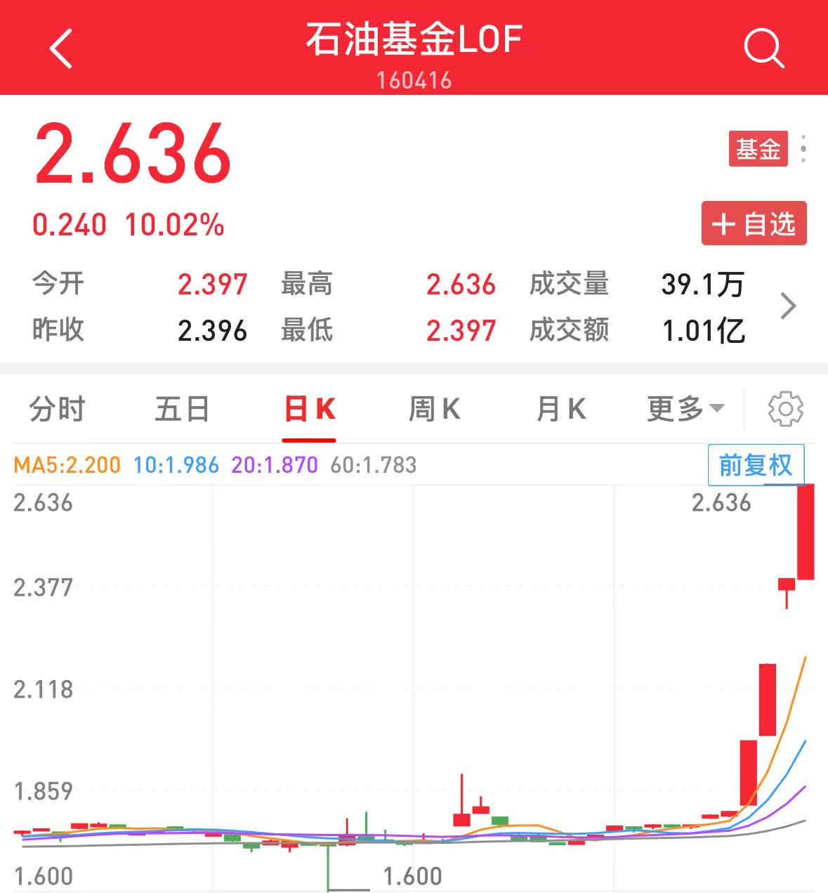 易方达基金公告,近期,易方达基金旗下易方达原油证券投资基金(QDII)A类人民币份额(基金代码:161129,场内简称:原油LOF易方达)二级市场交易价格明显高于基金份额净值。2026年1月27日,本基金基金份额净值为1.1315元,截至2026年1月29日,本基金在二级市场的收盘价为1.437元,特此提示投资者关注二级市场交易价格溢价风险,投资者如果高溢价买入,可能面临重大损失。