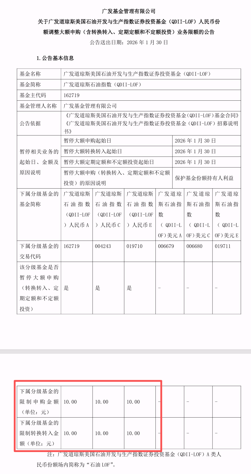 同时,广发基金决定,自2026年1月30日起,广发道琼斯美国石油开发与生产指数证券投资基金(QDII-LOF)人民币份额调整投资者单日单个基金账户申购(含定期定额和不定额投资)及转换转入本基金该类基金份额的业务限额为10.00元。