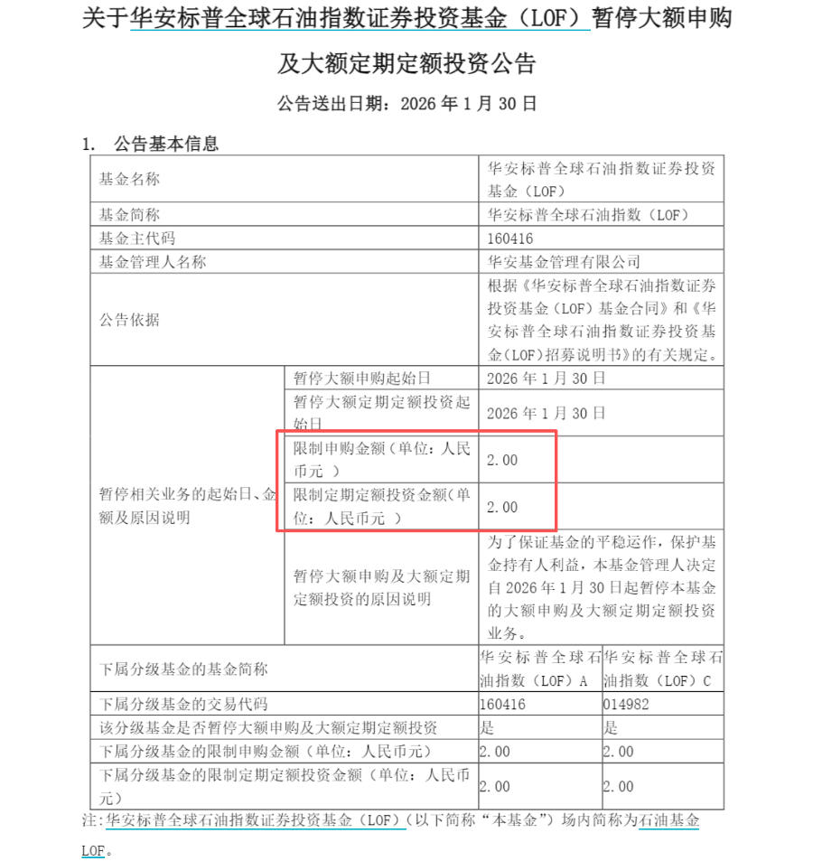 值得注意的是,该基金公告称,自1月30日起暂停大额申购及大额定期定额投资业务,每日累计投资限额降至2元。