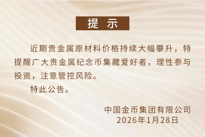 中国金币集团发布公告,近期贵金属原材料价格持续大幅攀升,特提醒广大贵金属纪念币集藏爱好者,理性参与投资,注意管控风险。