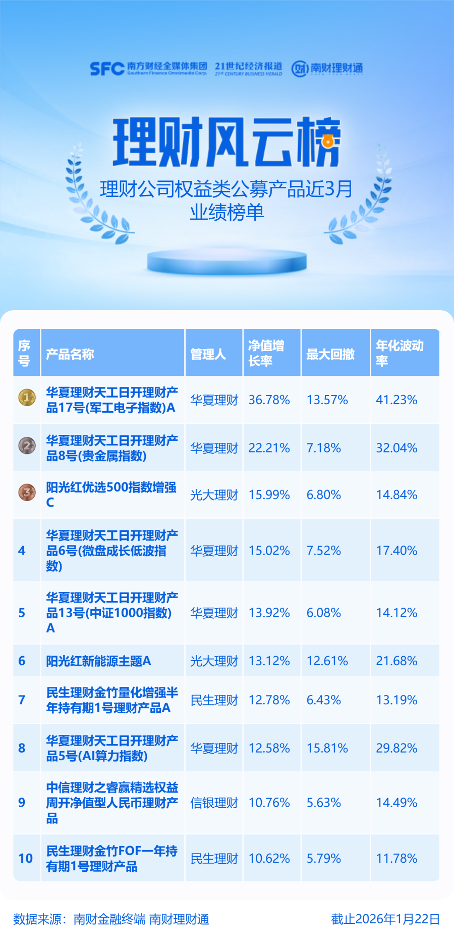 产品统计范围为理财公司权益类理财公募产品,统计截止日期为2026年1月22日,统计区间为近3个月。