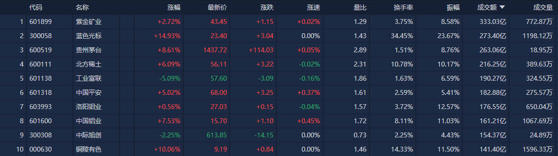 南财金融终端显示,个股方面,紫金矿业成交额超333亿元,蓝色光标成交额超273亿元,贵州茅台、北方稀土、工业富联等成交额靠前。