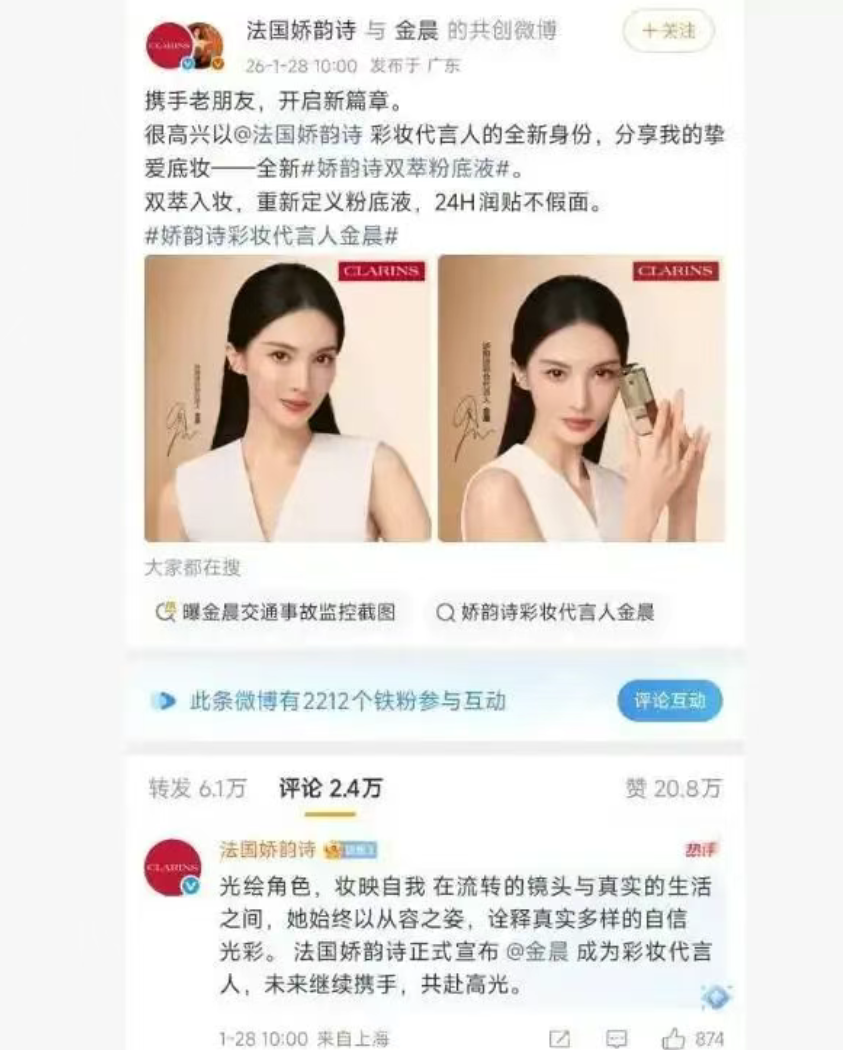 截至记者发稿,娇韵诗官方微博于1月28日发文,宣布金晨成为该品牌彩妆代言人,两者的共创微博仍然在首页置顶。