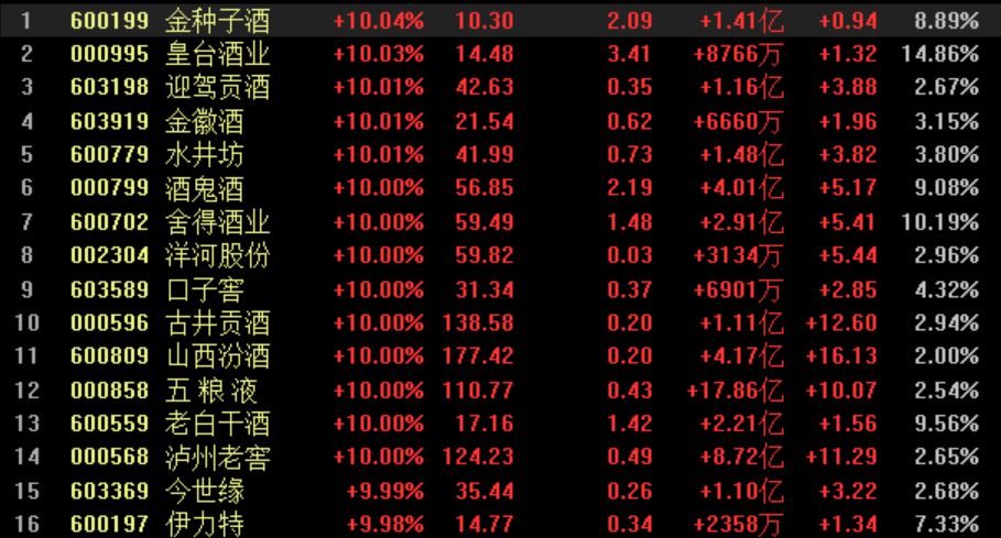 白酒板块突然爆发涨停潮,贵州茅台涨超8%,五粮液、山西汾酒、泸州老窖等多股涨停。