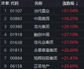 内房股领涨,当代置业涨超61%,中国奥园涨超34%,龙光集团、融创中国、佳兆业集团、合景泰富集团等涨超20%。