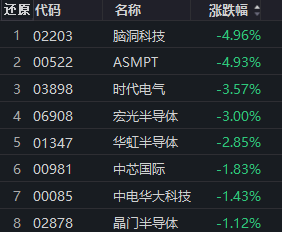 半导体概念走弱,脑洞科技、ASMPT跌近5%。