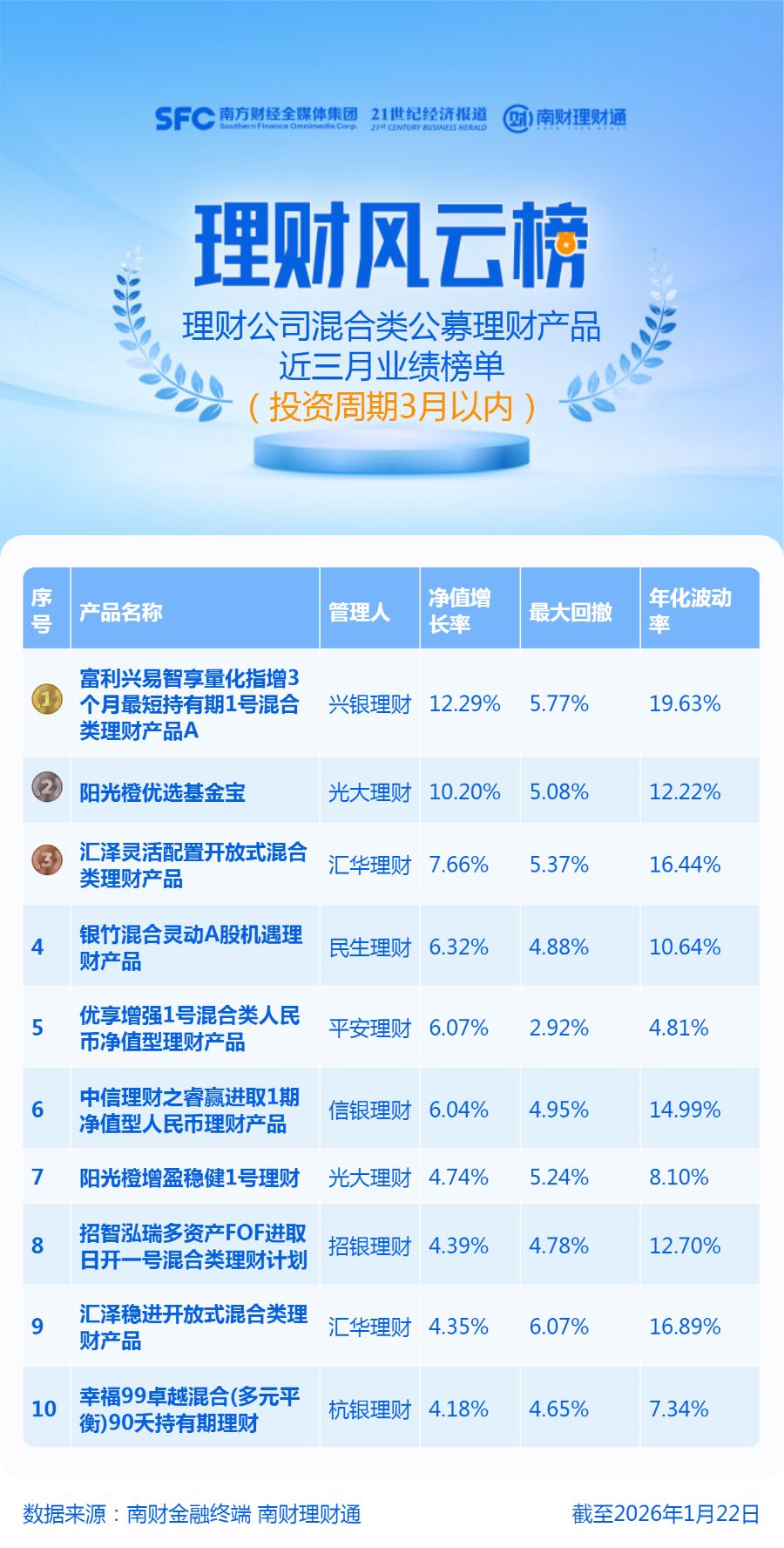 产品统计范围为理财公司3月以内期限的混合类公募理财,产品统计截止日期为2026年1月22日,统计区间为近一年。