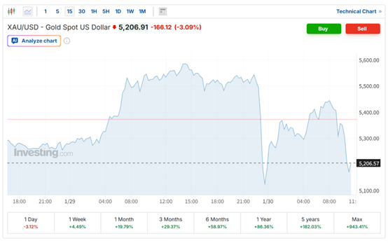 周四国际金价大幅震荡,现货金价最高逼近5600美元,而最低下探至5100美元附近,单日振幅接近500美元。周五亚盘,金价因投资者获利了结而大幅走低,截至发稿,现货金徘徊在5200美元附近。
