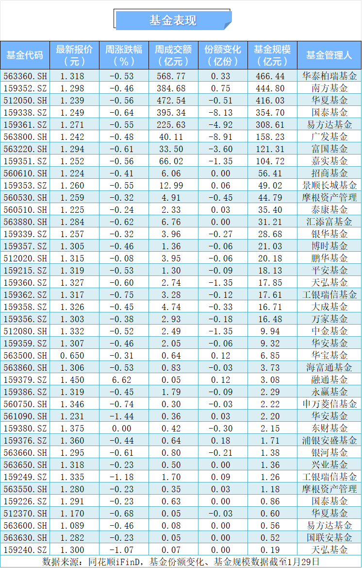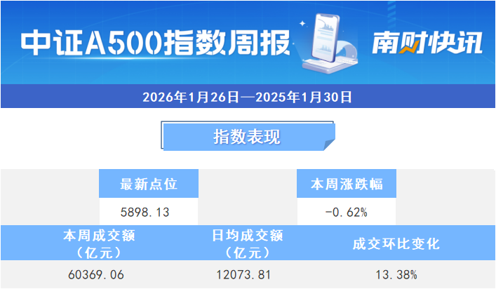 本周中证A500指数跌0.62%,截至1月30日收盘,报5898.13点。本周日均平均成交额为12073.81亿元,单日成交额环比涨13.38%。本周40只中证A500基金中有38只下跌,其中华安基金的中证A500增强ETF跌幅最大,为1.44%。