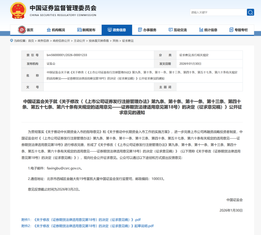 1月30日,中国证监会就《关于修改〈《上市公司证券发行注册管理办法》第九条、第十条、第十一条、第十三条、第四十条、第五十七条、第六十条有关规定的适用意见——证券期货法律适用意见第18号〉的决定(征求意见稿)》公开征求意见。主要修改内容包括,扩大战略投资者类型。明确全国社保基金、基本养老保险基金、企业(职业)年金基金、商业保险资金(保险公司运用保险资金自行投资或者委托关联保险资产管理机构以及作为单一投资人通过关联保险资产管理机构发行的股权投资计划投资)、公募基金、银行理财等机构投资者可以作为战略投资者,以耐心资本作为战略性资源对上市公司战略投资。同时,在规则上将该类投资者界定为资本投资者,将其他实业投资者界定为产业投资者。明确最低持股比例要求。
