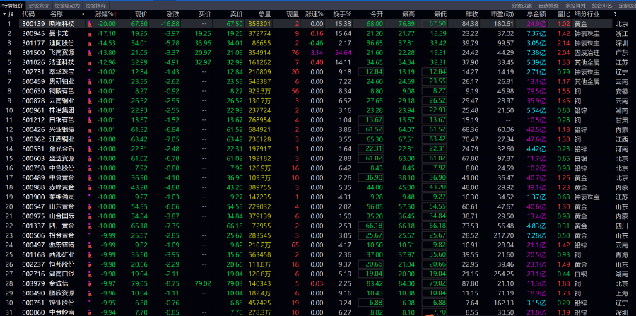 今日,随着黄金价格大跌,相关行业股票也出现下跌,板块内晓程科技、中金黄金、赤峰黄金、山东黄金、四川黄金、招金黄金、恒邦股份等26只个股跌停,板块重挫8.89%,黄金股ETF跌停。