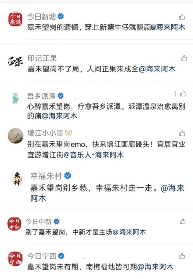 这波操作还是矩阵式的,当地13个镇街的官方账号涌入海来阿木的评论区,强势接梗。
