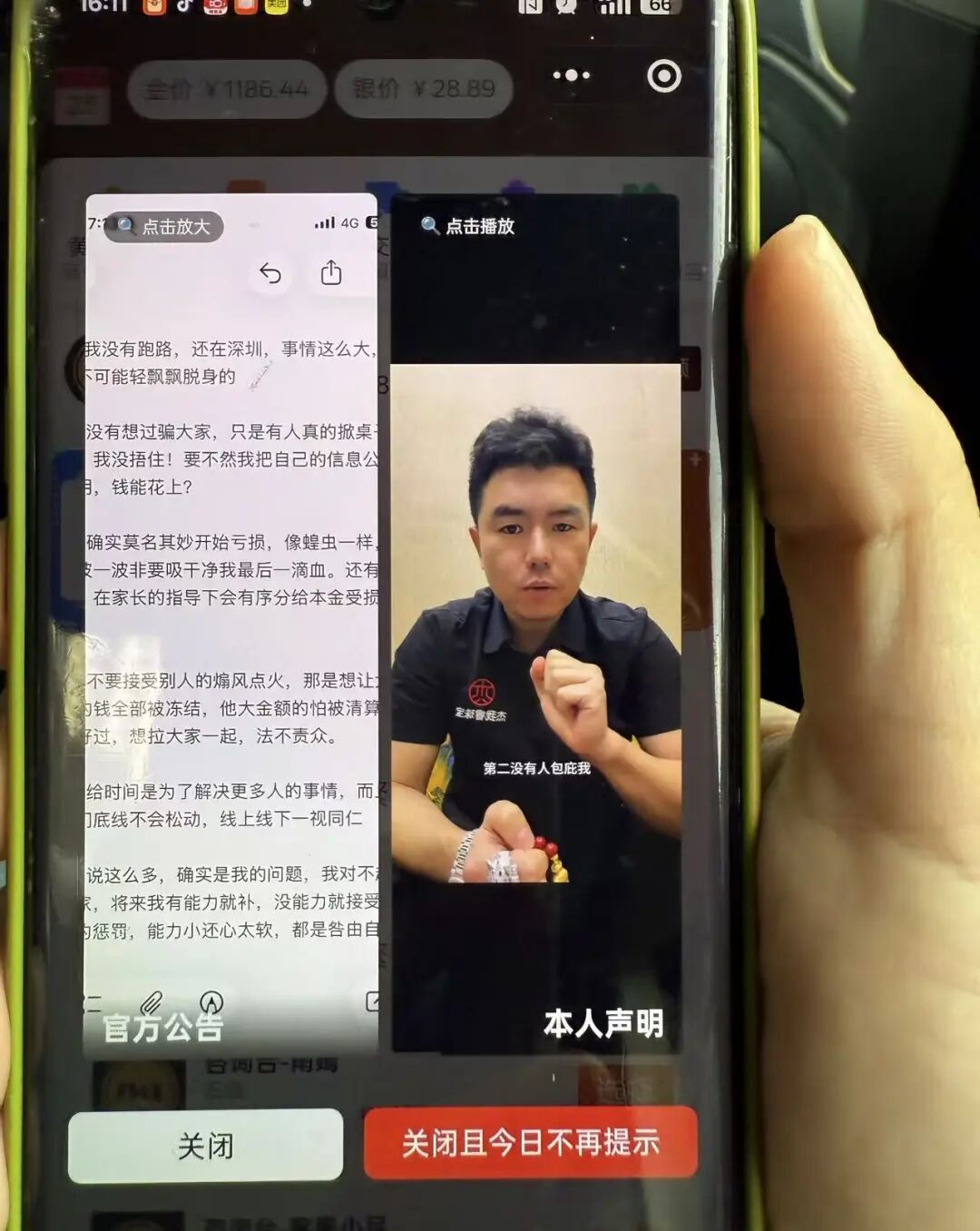 张志腾此前1月27日录制的“本人声明”影像,至今仍在杰我睿小程序首页不断循环播放。他在视频中说道,“我没有跑路,人还在深圳,没有想过骗大家,只是有人真的掀桌子了,我没捂住!确实莫名其妙开始亏损,像蝗虫一样,一波一波非要吸干净我最后一滴血。现在面临的问题是银行卡一直被冻结,我手里的实物料没有人敢接收。”