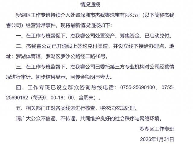 罗湖区工作专班持续介入处置深圳市杰我睿珠宝有限公司(以下简称杰我睿公司)经营异常事件,现将最新情况通报如下: