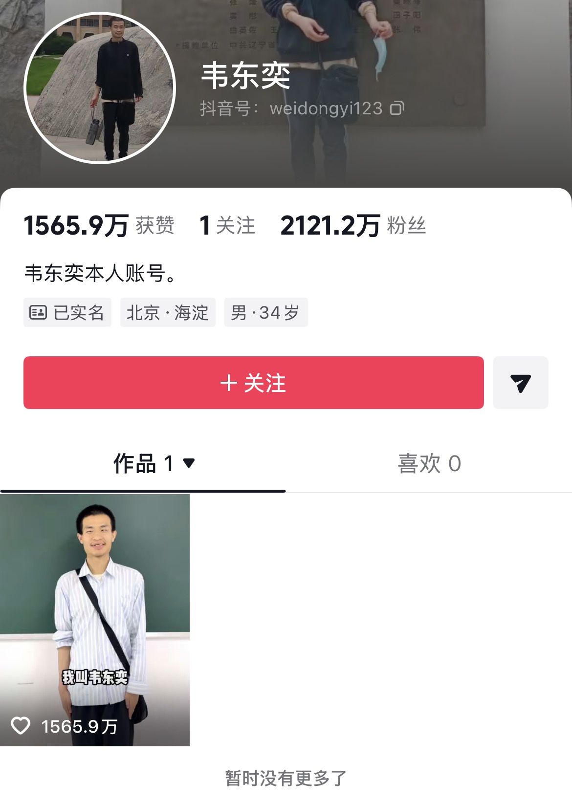 2025年6月初,韦东奕在短视频平台开通个人社交账号,并且发布一段介绍自己的短视频,引发网民关注。截至目前,最新粉丝数为2121.2万。