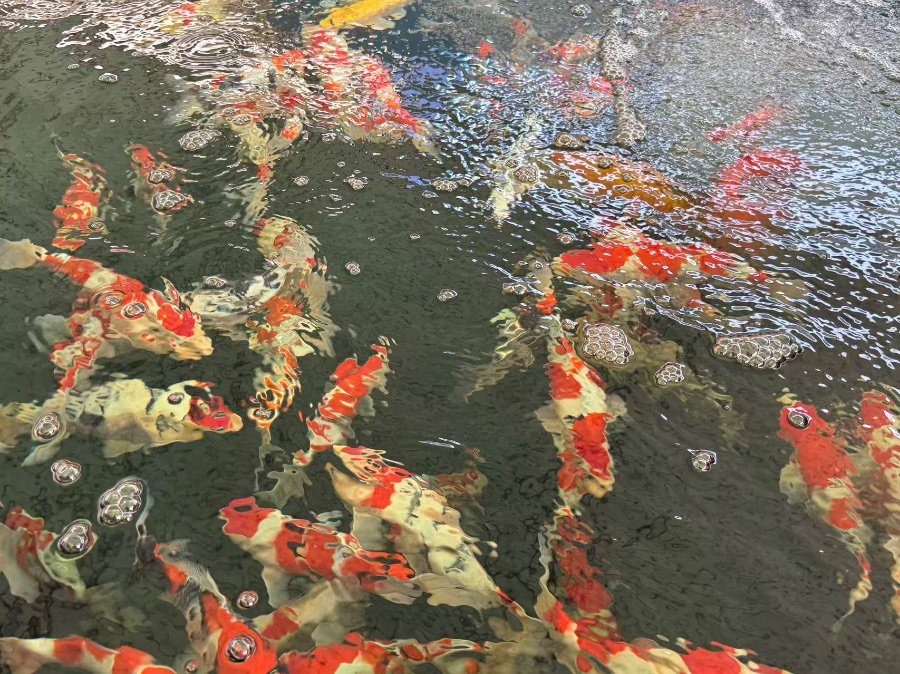 各类品种的锦鲤自在游弋,搅动水面波光粼粼。 吴蓉 摄
