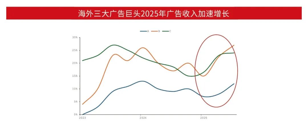 在广告方面,2025年海外科技巨头广告收入增速持续上升,AI推动厂商获取增量流量和用户时长,进而提升广告份额,驱动广告市场扩容。