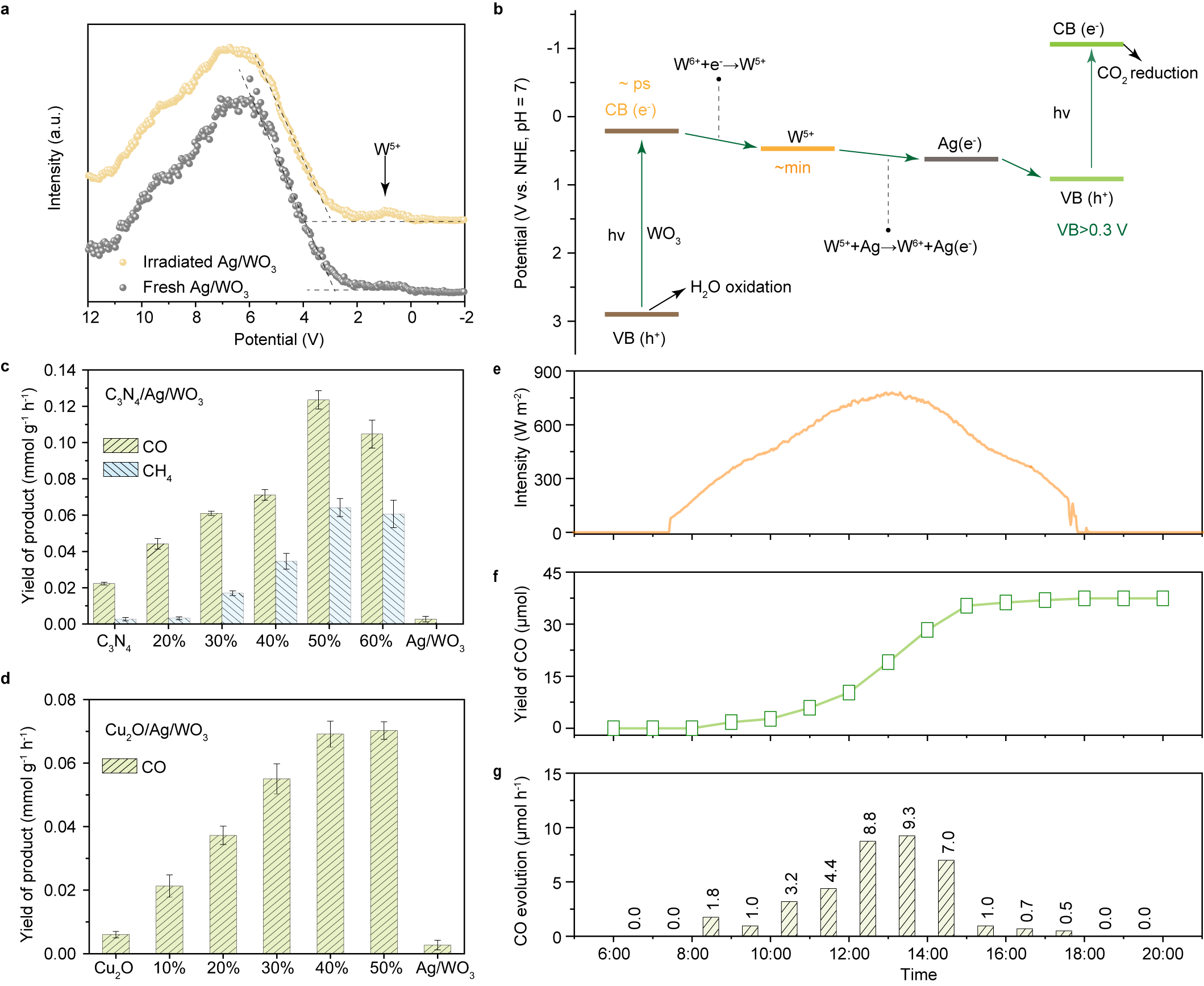 我国科研团队这项新方案模拟植物暂存光生电子的生理机制,创新性地设计出一种电子存储路径,通过定向设计、制备材料结构,使其能够在光照时储存电子,并在需要时精准释放,从而实现对二氧化碳与水反应速率和程度的精确调控。基于这一思路,研究团队成功构建出具有电子存储功能的银修饰三氧化钨(Ag/WO)材料。通过将其与催化活性组分酞菁钴复合进行验证,测得二氧化碳转化效率较纯酞菁钴提升了近百倍。此外,这一策略具备良好的通用性与适用性,可根据实际需求构建多种结构适配的复合催化剂体系。该方案在自然光条件下运行稳定,为利用太阳能规模化转化二氧化碳、生产一氧化碳、甲烷等清洁能源提供了可行的技术路径。