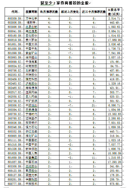 其中,获4家券商推荐个股有4只,分别是万华化学、福斯特、兆易创新、海光信息;获3家券商推荐个股则有巨化股份、贵州茅台、中国太保、中国中免、紫金矿业和洛阳钼业;获3家券商推荐个股则有29只,包括了招商银行、中国平安等大盘蓝筹。