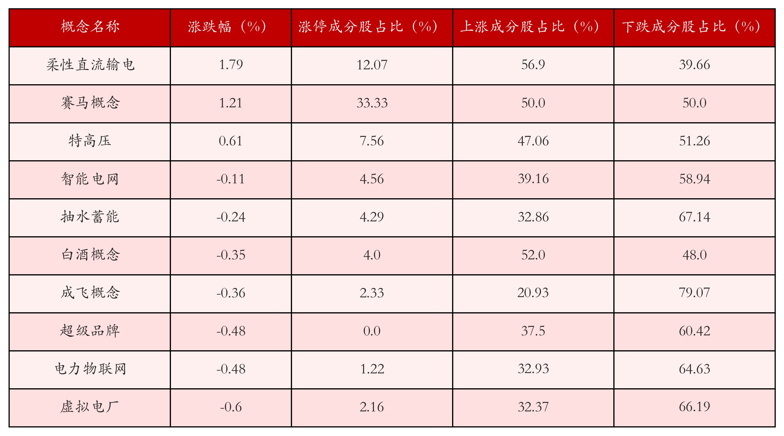 根据A股概念涨跌幅与所对应的股票池综合分析,涨幅靠前的三个概念板块分别为:柔性直流输电、赛马概念与特高压。排名前10位的概念板块相关数据见下表:
