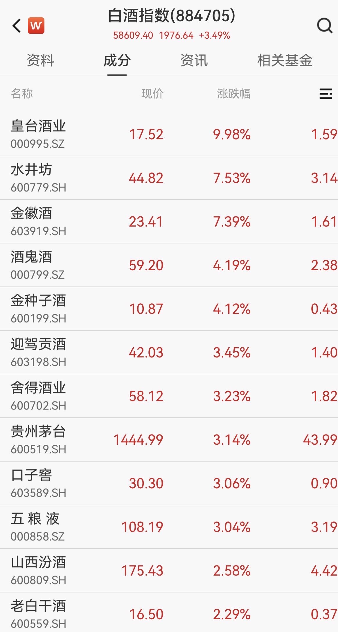 2月2日,白酒板块延续回暖态势,迎来集体大涨。截至当日10时31分,白酒指数(884705)涨幅超3%,成分股全线飘红,其中皇台酒业盘中涨停,水井坊、金徽酒涨幅超7%,酒鬼酒、金种子酒、贵州茅台等涨幅超3%,洋河股份、泸州老窖、今世缘等核心个股同步跟涨,市场做多情绪升温。