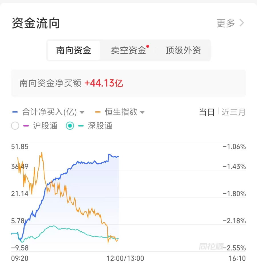 南向资金方面,南向资金半日净买额达44.13亿港元。