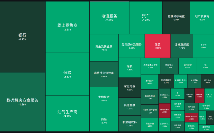 根据富途牛牛数据,银行板块下跌0.93%,线上零售商板块下跌3.41%,保险行业下跌2.57%,油气生产商板块下跌3.90%,汽车板块下跌5.52%。