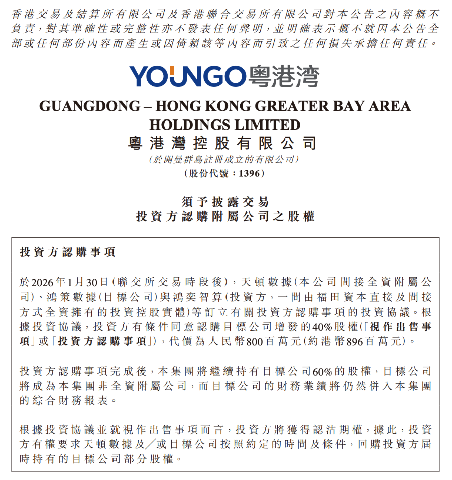 根据粤港湾控股公告,福田资本、天顿数据就目标公司入股事项订立投资协议,根据投资协议,福田资本有条件认购目标公司增发的40%股权,代价为8亿元。