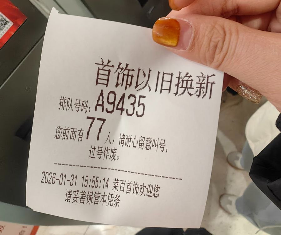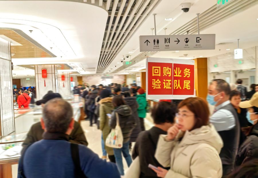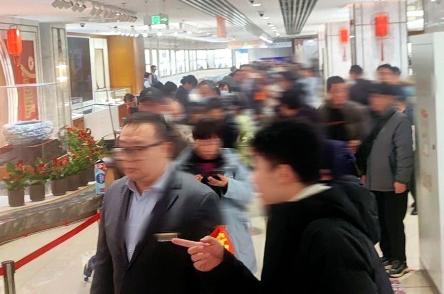 2月1日上午11点,菜百首饰(下称“菜百”)总店三楼“旧金回收”柜台前,队伍已蜿蜒排至电梯口,粗略有三五百人。空气里是嗡嗡的交谈声,混合着一种克制的焦灼。