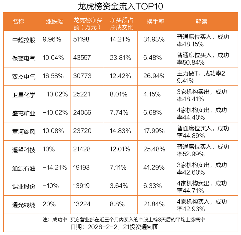 2月2日,上证指数下跌2.48%,深证成指下跌2.69%,创业板指下跌2.46%。盘后龙虎榜数据显示,共有60只个股因当日异动登上龙虎榜,资金净流入最多的是中超控股(002471.SZ),达5.12亿元。