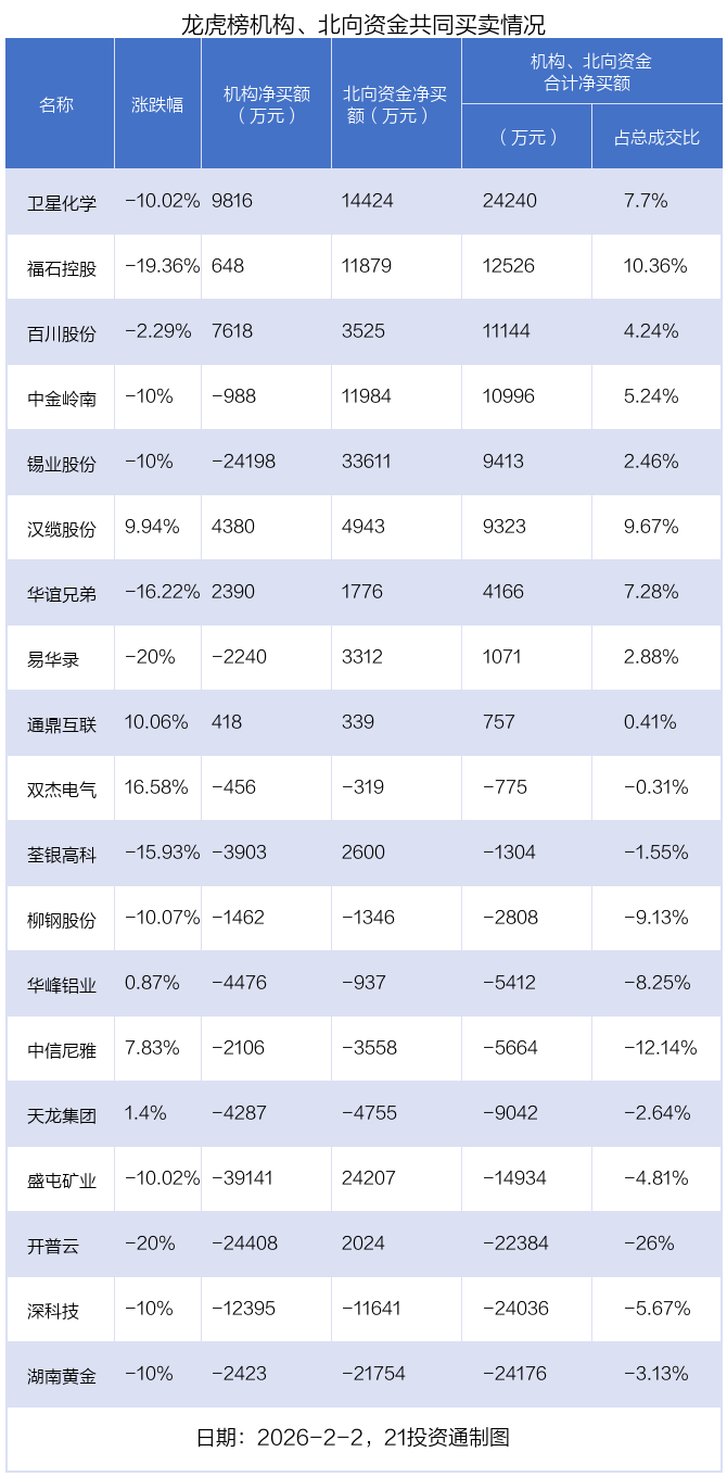 值得注意的是,机构和北向资金共同净买入了卫星化学、福石控股、汉缆股份、百川股份、华谊兄弟、通鼎互联;共同净卖出了双杰电气、华峰铝业、柳钢股份、中信尼雅、天龙集团、深科技、湖南黄金;在锡业股份,盛屯矿业,中金岭南,易华录,荃银高科,开普云上出现分歧,机构净卖出锡业股份2.42亿元,北向资金净买入3.36亿元;机构净卖出盛屯矿业3.91亿元,北向资金净买入2.42亿元;机构净卖出中金岭南988.24万元,北向资金净买入1.2亿元;机构净卖出易华录2240.43万元,北向资金净买入3311.91万元;机构净卖出荃银高科3903.48万元,北向资金净买入2599.56万元;机构净卖出开普云2.44亿元,北向资金净买入2023.68万元。