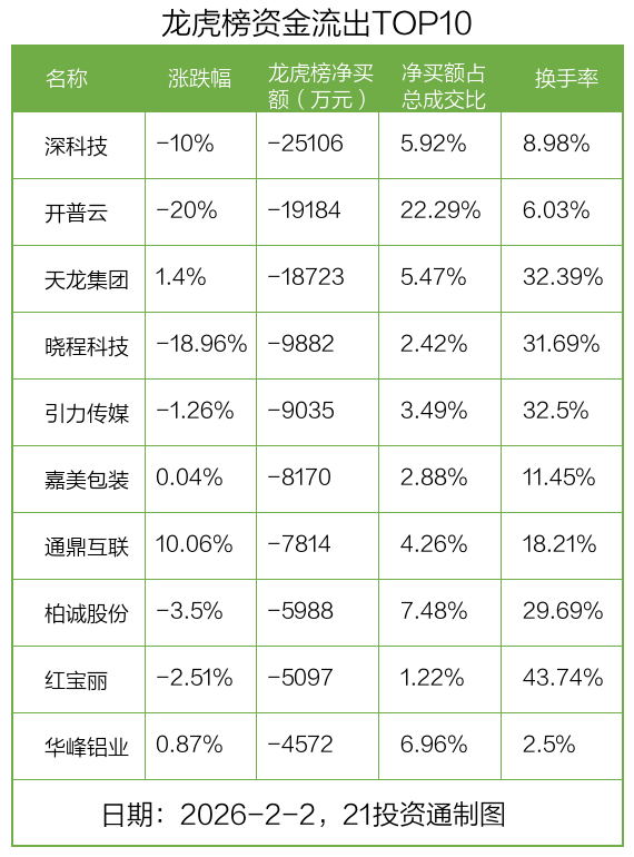 而龙虎榜中资金净流出最多的是深科技(000021.SZ),被净卖出为2.51亿元,占总成交金额的5.92%。深科技收盘下跌10%,换手率为8.98%。