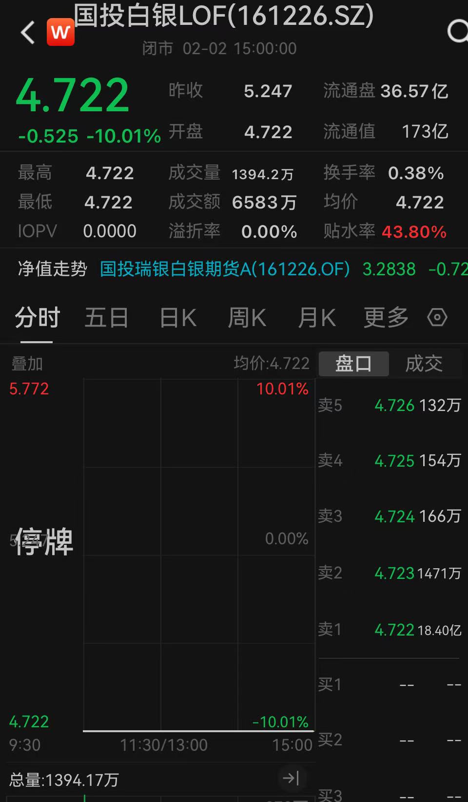 2月2日,白银LOF停牌一小时后复牌,并一字跌停,收盘价4.722元,尽管跌停,其交易价格仍较基金净值高出43.8%。