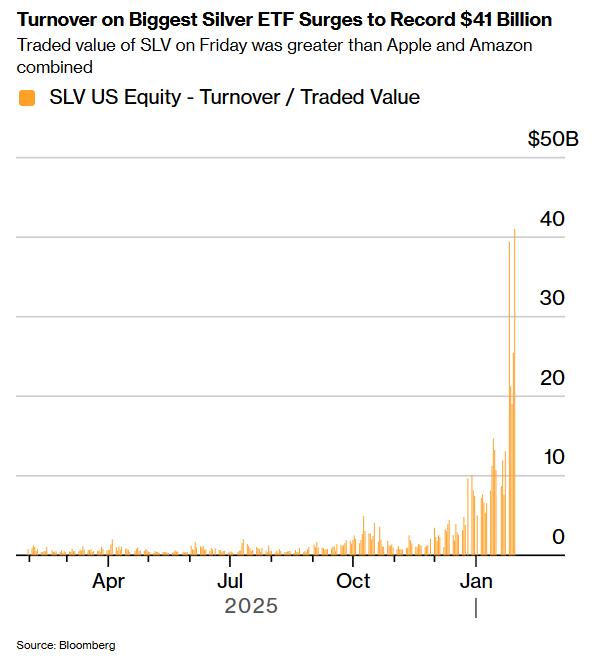 上周五,全球最大的白银交易所交易基金iShares Silver Trust(SLV)录得超过400亿美元的成交额。这使其成为全球交易最活跃的证券之一,而仅仅数月前,其日成交额很少超过20亿美元。