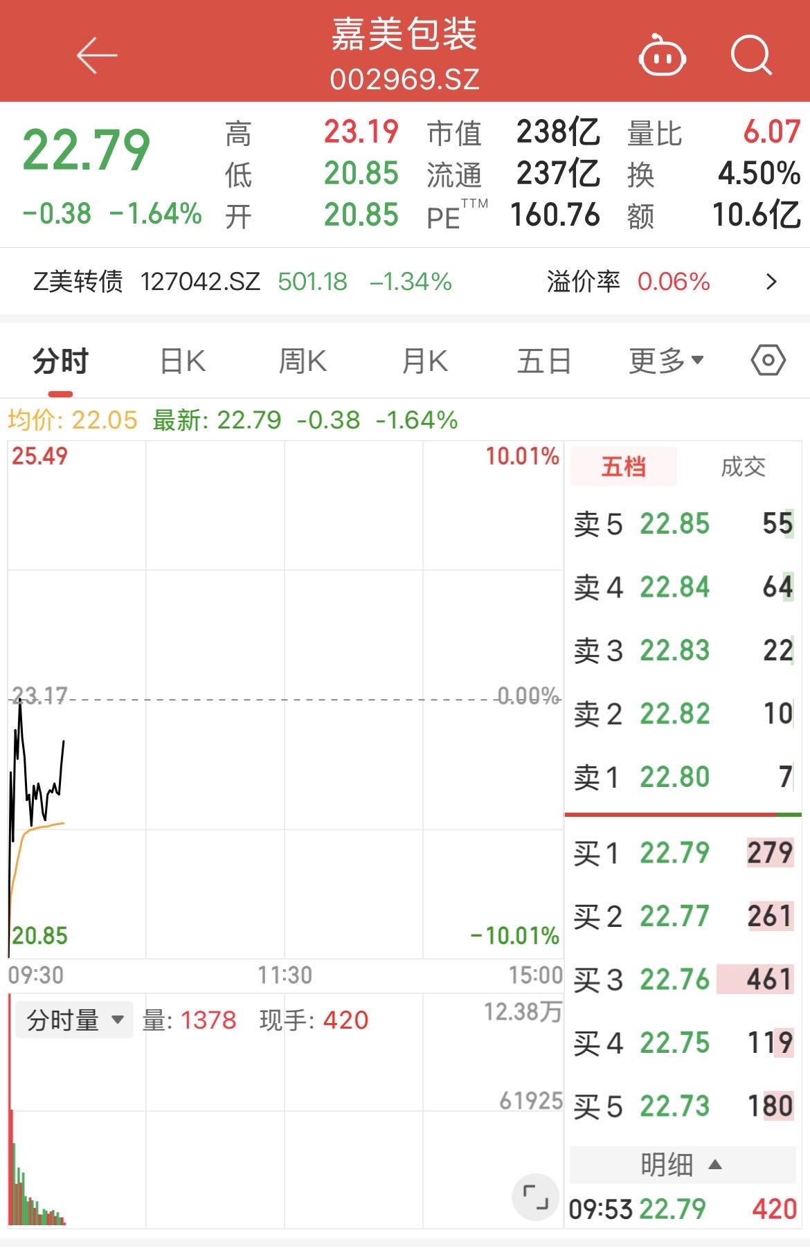 2月2日,A股市场两只“超级大牛股”锋龙股份(002931.SZ)与嘉美包装(002969.SZ)同日复牌,股价开盘后均遭遇跌停,但随后买盘涌现,股价震荡拉升,跌幅显著收窄。截至9时53分,锋龙股份报95.77元/股,跌幅3.78%;嘉美包装报22.79元/股,跌幅1.64%。