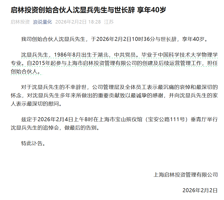 2月2日,百亿级私募启林投资发布公告称,公司创始合伙人沈显兵先生,于2026年2月2日10时36分与世长辞,享年40岁。