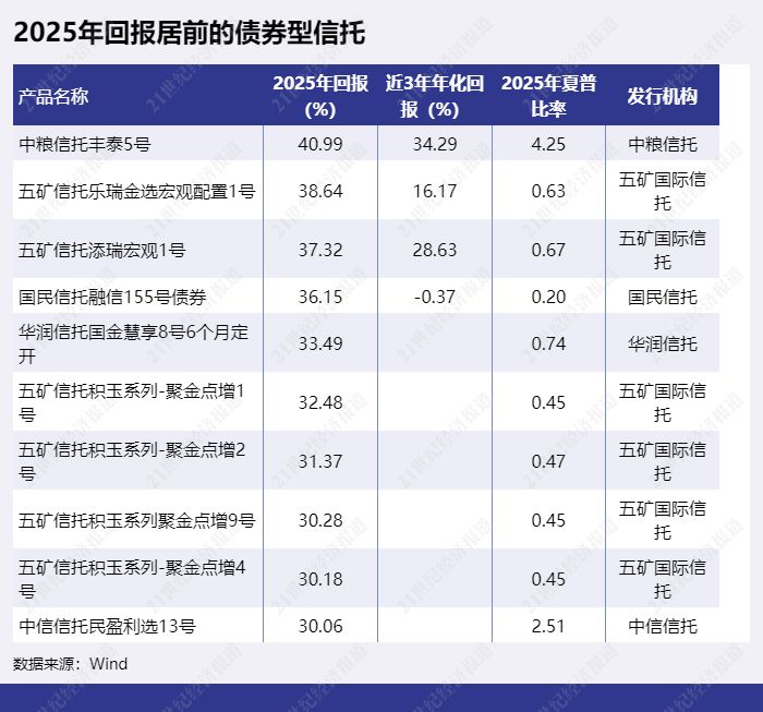 2025年收益率最高的债券型信托为“中粮信托丰泰5号”,2025年回报达40.49%。其次为“五矿信托乐瑞金选宏观配置1号”,2025年回报为38.64%。“五矿信托添瑞宏观1号”以37.32%的收益率排第三。