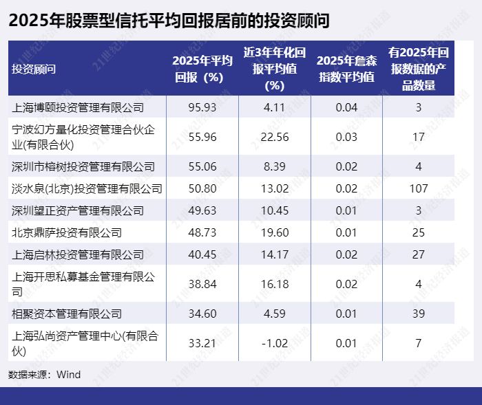 不少股票型信托为阳光私募,由私募机构担任投资顾问,若以投资顾问统计股票型信托2025年平均回报,上海博颐投资管理有限公司担任投资顾问的股票型信托2025年平均回报最高,达95.93%。量化巨头幻方量化的股票型信托2025年平均回报达55.96%,排第二。