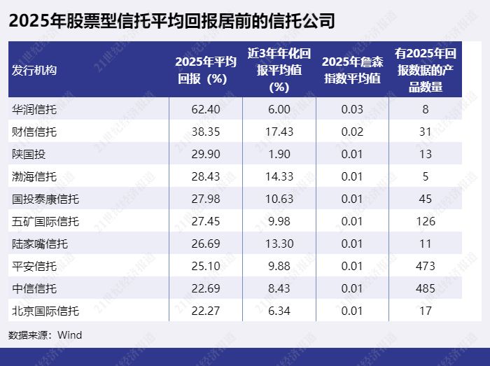 股票型信托2025年平均回报最高的信托公司为华润信托,2025年平均回报达62.4%。平均回报排第二的是财信信托,2025年平均回报为38.35%。陕国投以29.9%排第三。