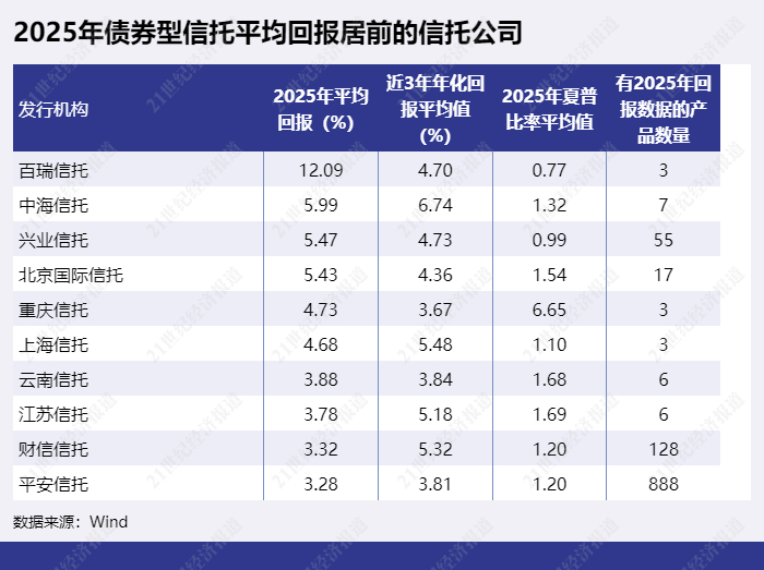从信托公司发行的债券型信托综合表现来看,债券型信托2025年平均回报最高的信托公司为百瑞信托,平均回报达12.09%。百瑞信托有2025年回报数据的产品较少,主要由于有一只回报达28.04%的信托产品拉高了平均收益率。