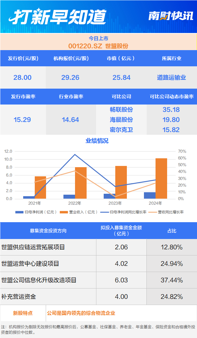 2月3日,有一只新股上市,为深市主板的世盟股份(001220.SZ)。该公司成立于2010年,主要专注于为生产制造业企业提供包括供应链综合物流服务和干线运输服务在内的全方位、一体化供应链合同物流服务。