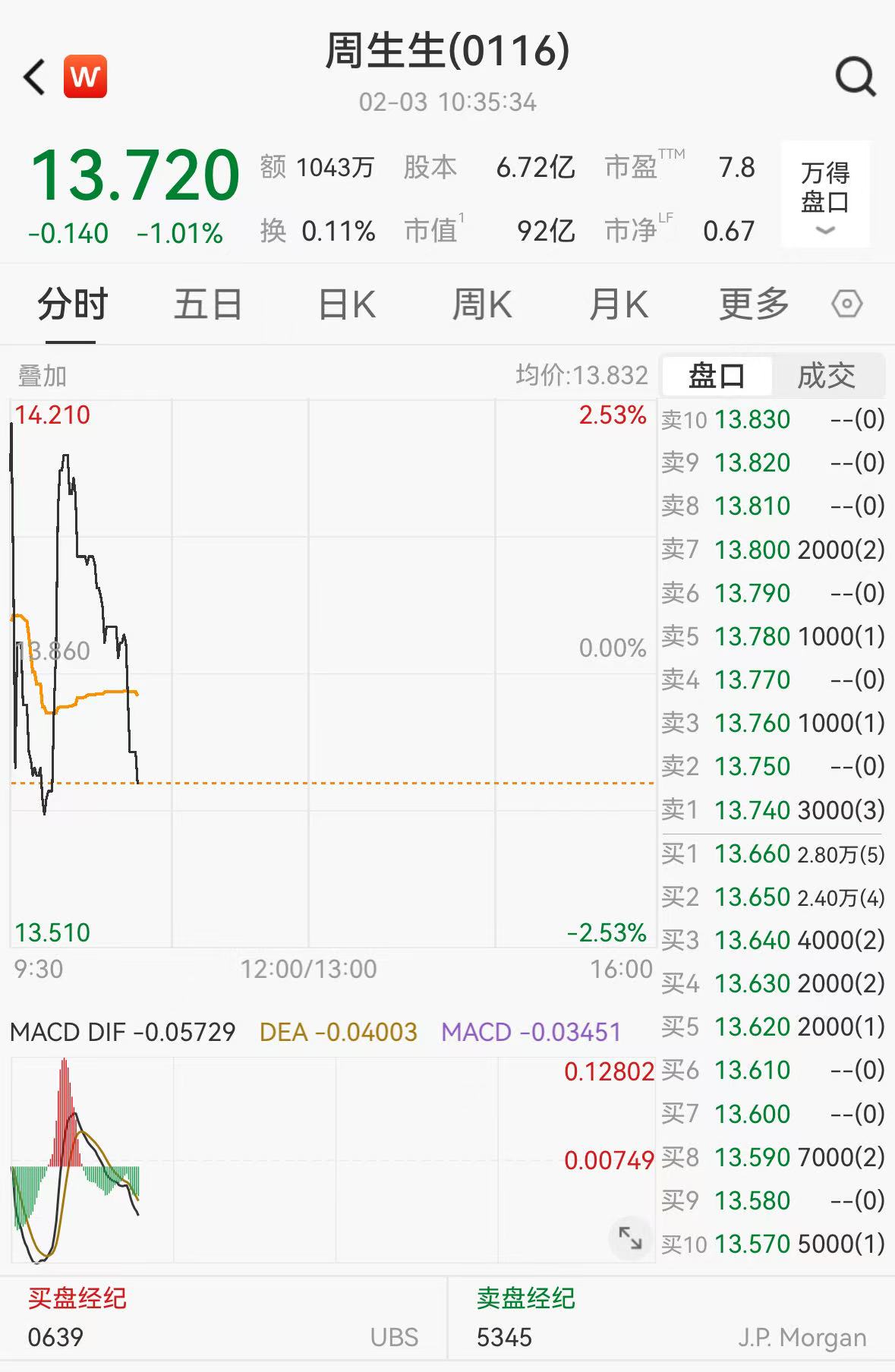 截至2月3日10:35,周生生港股报13.72港元/股,跌1.01%,总市值为92亿港元。