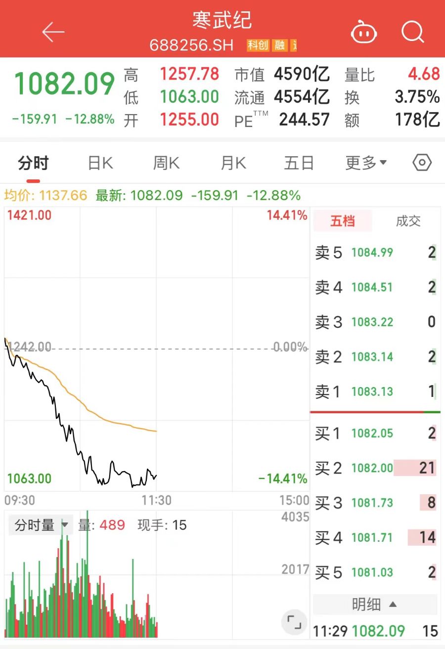 2月3日,国产AI芯片龙头寒武纪(688256.SH)股价盘中出现大幅下挫,公司股价延续走低态势,市场交易情绪较为低迷。截至午盘,寒武纪报1082.09元/股,跌幅进一步扩大至12.88%,公司总市值同步回落至5000亿元下方。
